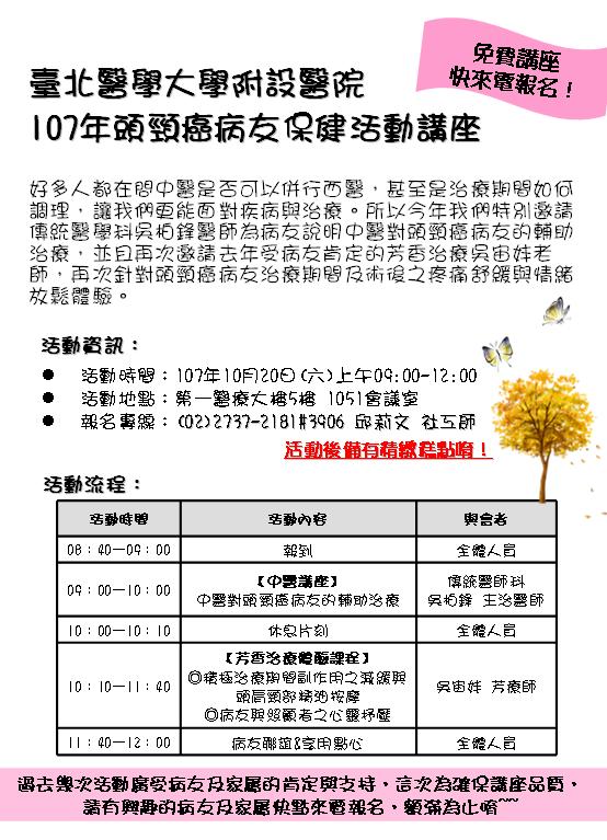 【活動】10/20 頭頸癌病友活動講座,歡迎報名。