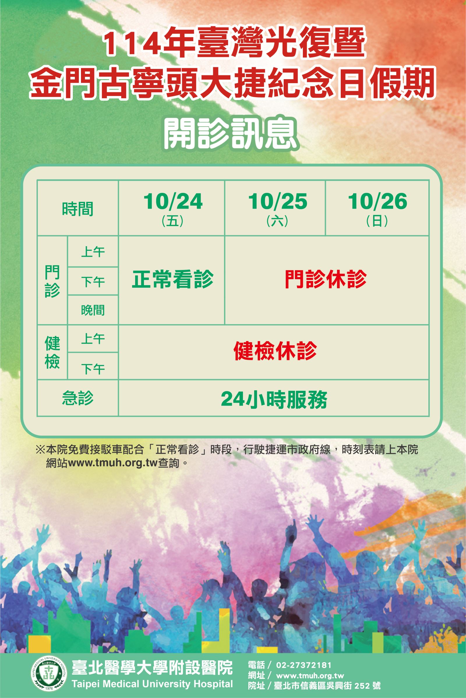 【公告】臺灣光復暨金門古寧頭大捷紀念日(10/24)門診正常看診、健檢休診;急診照常服務