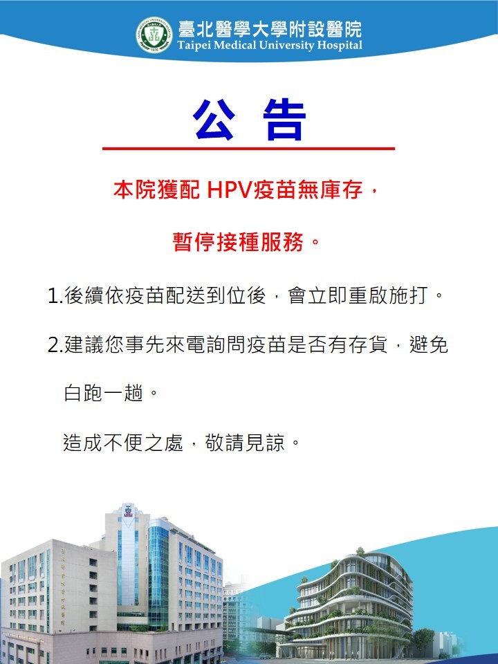 【公告】本院獲配HPV疫苗無庫存 暫停接種服務