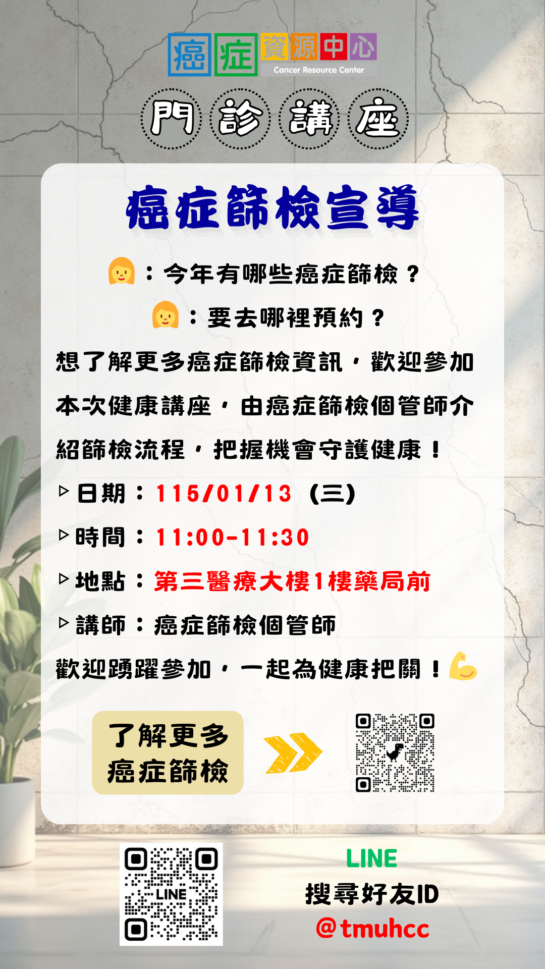 【活動】01/13(三) 門診講座-癌症篩檢宣導 歡迎參加