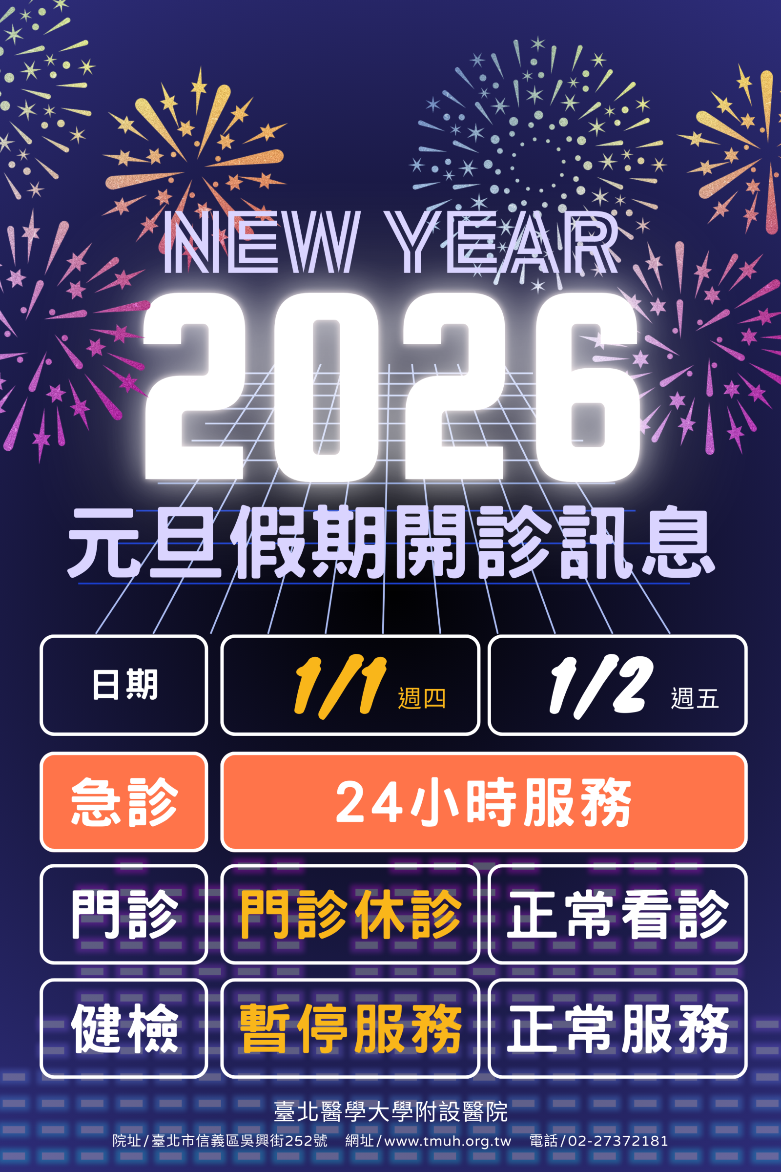 【公告】元旦(1/1) 門診/健檢休診;急診照常服務