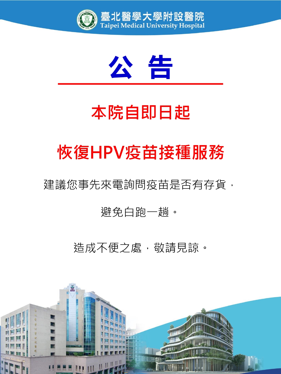 【公告】本院自即日起恢復HPV疫苗接種服務