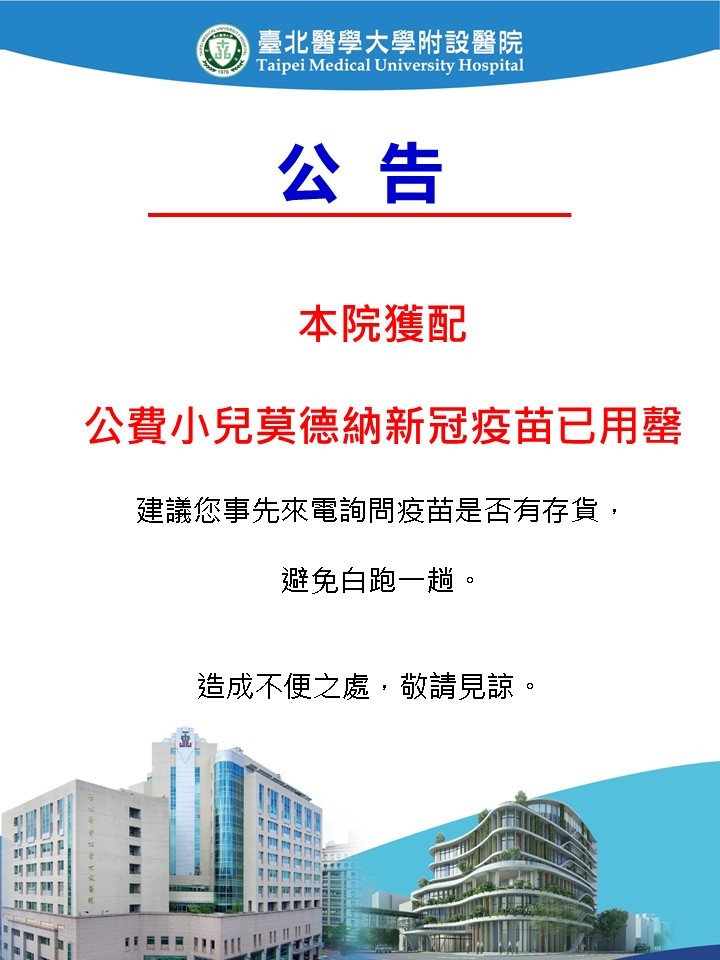 【公告】本院獲配公費小兒莫德納新冠疫苗已用罄
