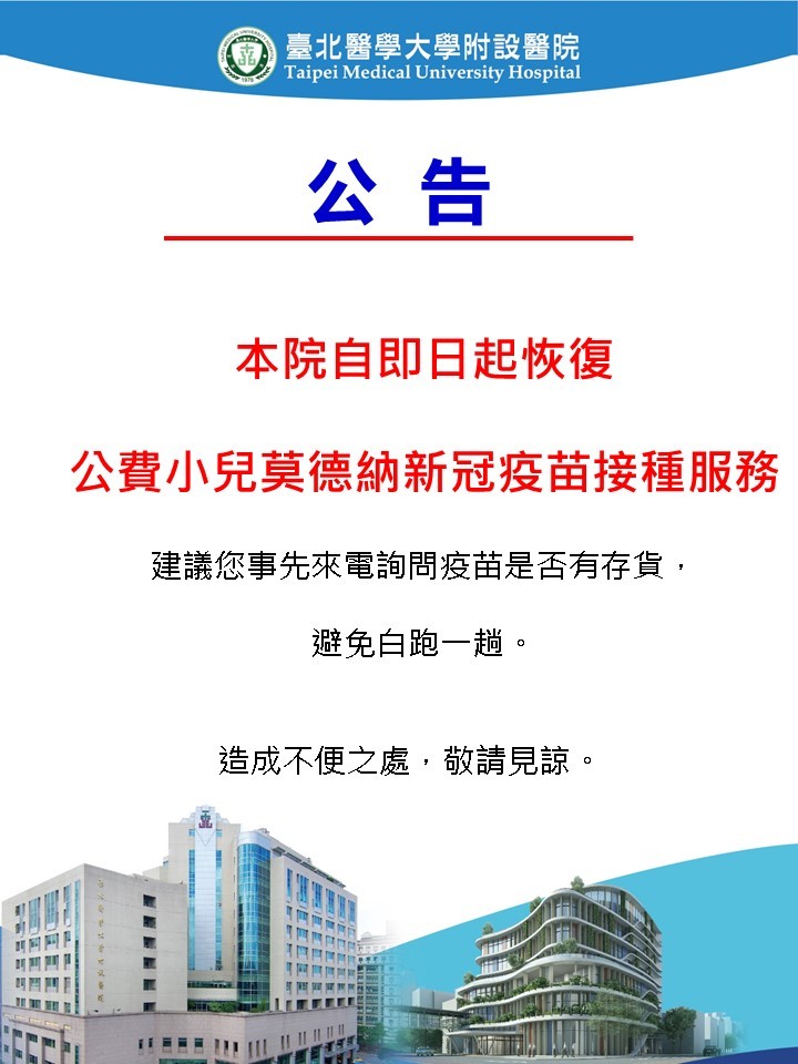 【公告】本院恢復公費小兒莫德納新冠疫苗接種服務