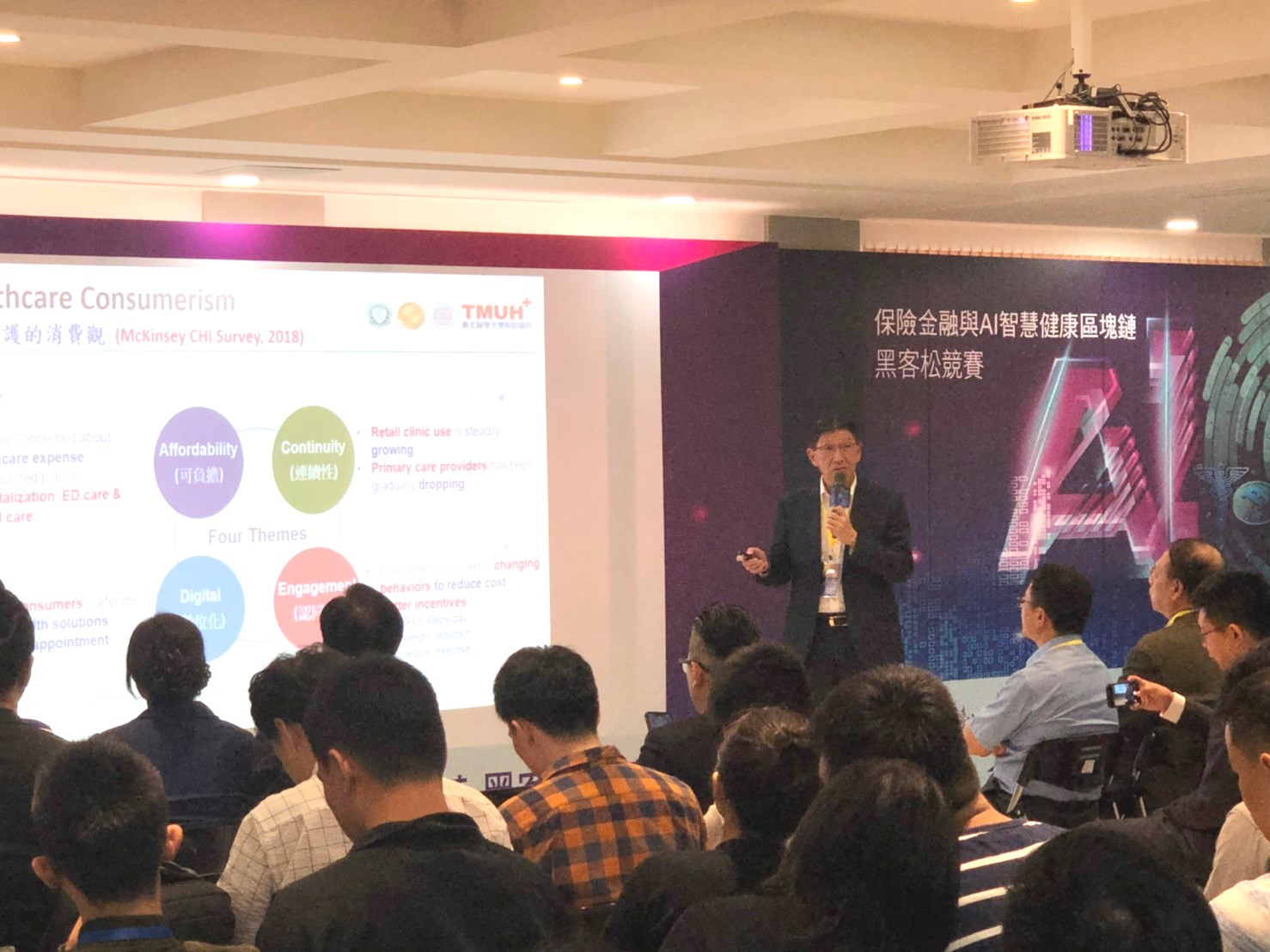 北醫附醫陳瑞杰院長以Health is a Choice, not Chances為題發表演講,他表示,隨著人口老化、慢性病患增加,全球健康產業面臨嚴峻挑戰,照護人員不足與長期照護都是問題;預估未來2025年醫療產業有20%工作需要AI協助,以自動化取代人力。