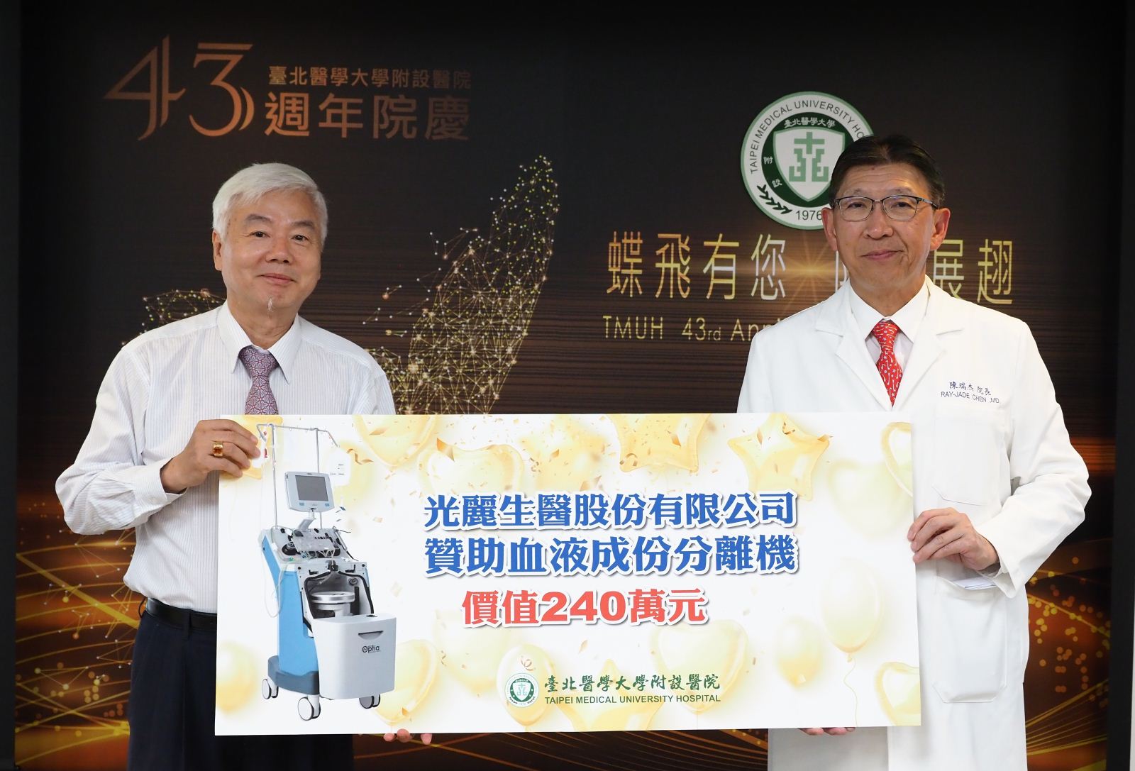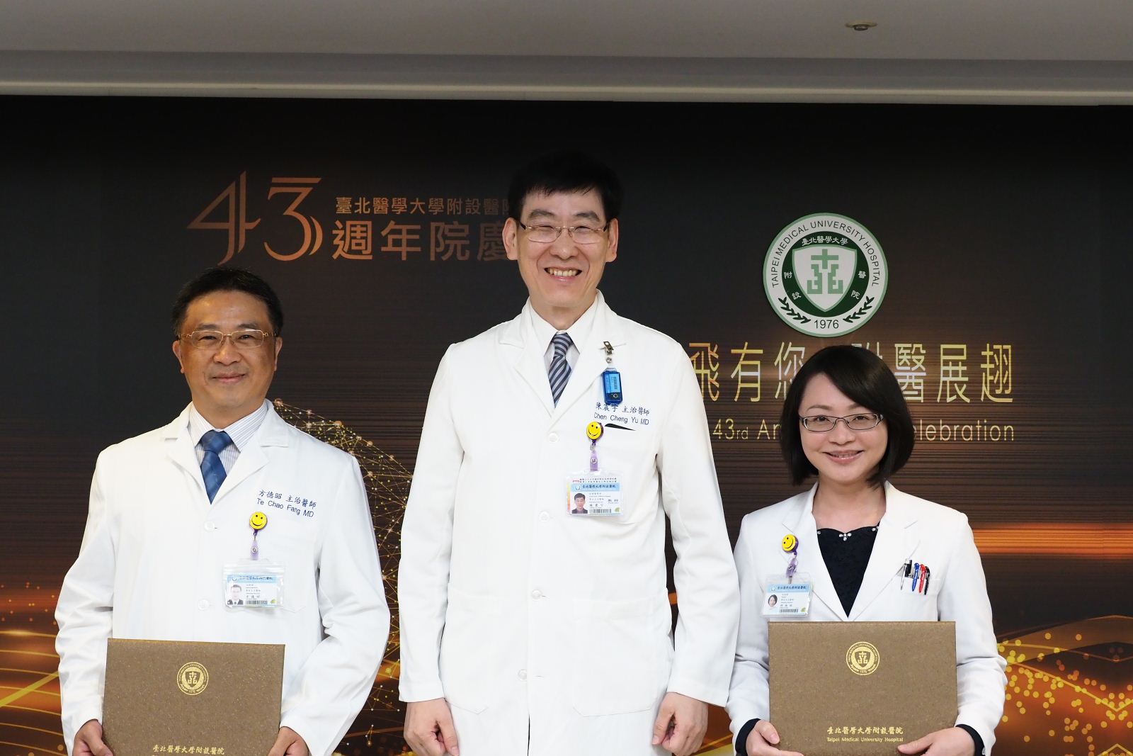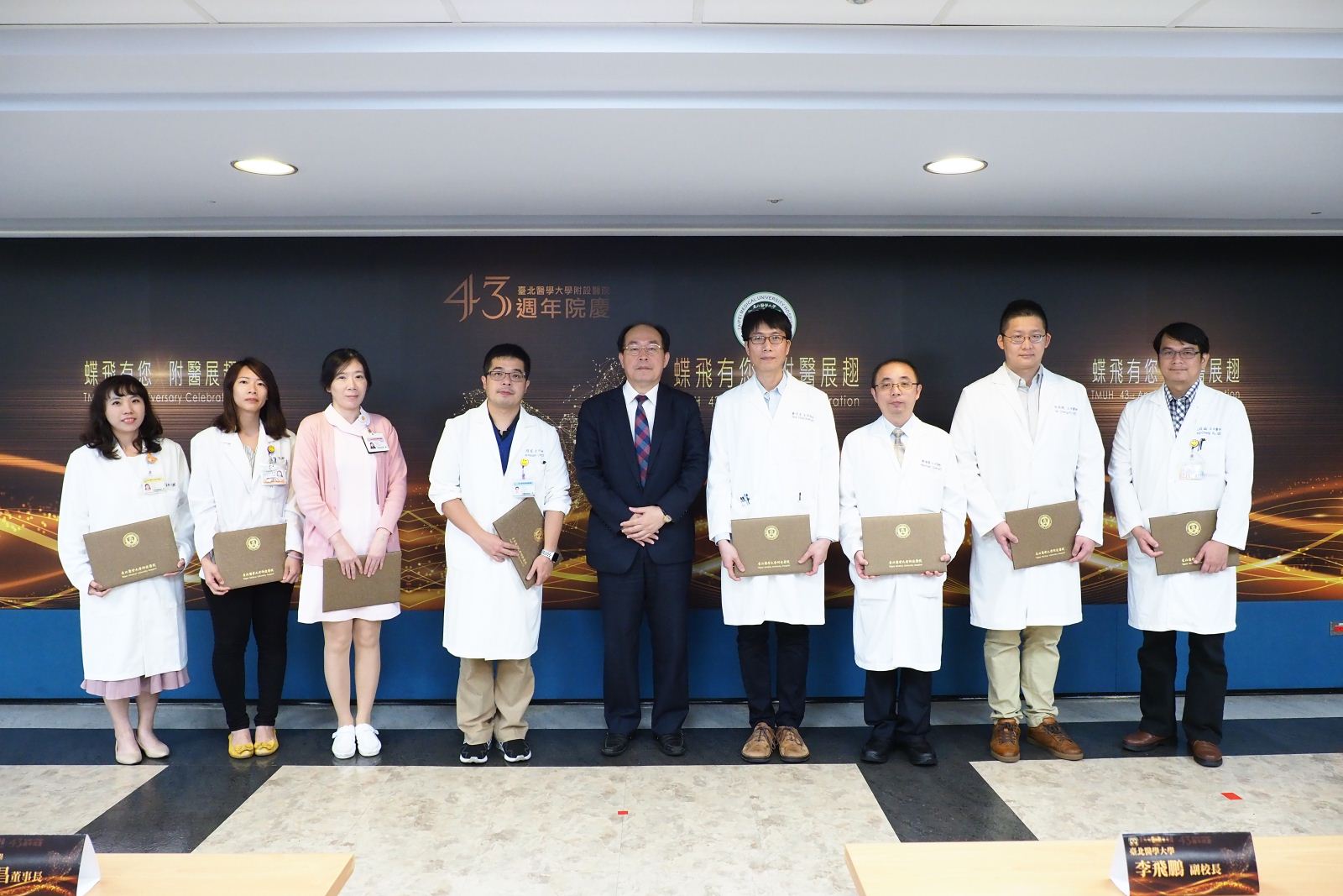 臺北醫學大學附設醫院於8月6日歡度43週年院慶,今年院慶以「蝶飛有您 附醫展翅」為主題,感謝社會各界的支持與院內同仁的努力,讓附醫蛻變展翅,以嶄新面貌提供民眾更優質的醫療服務;同時,今年院慶舉辦「附醫十勝」票選活動,邀請同仁選出最能代表附醫的十個地點,票選結果也於院慶典禮揭曉。(📹 院慶相關報導請點)