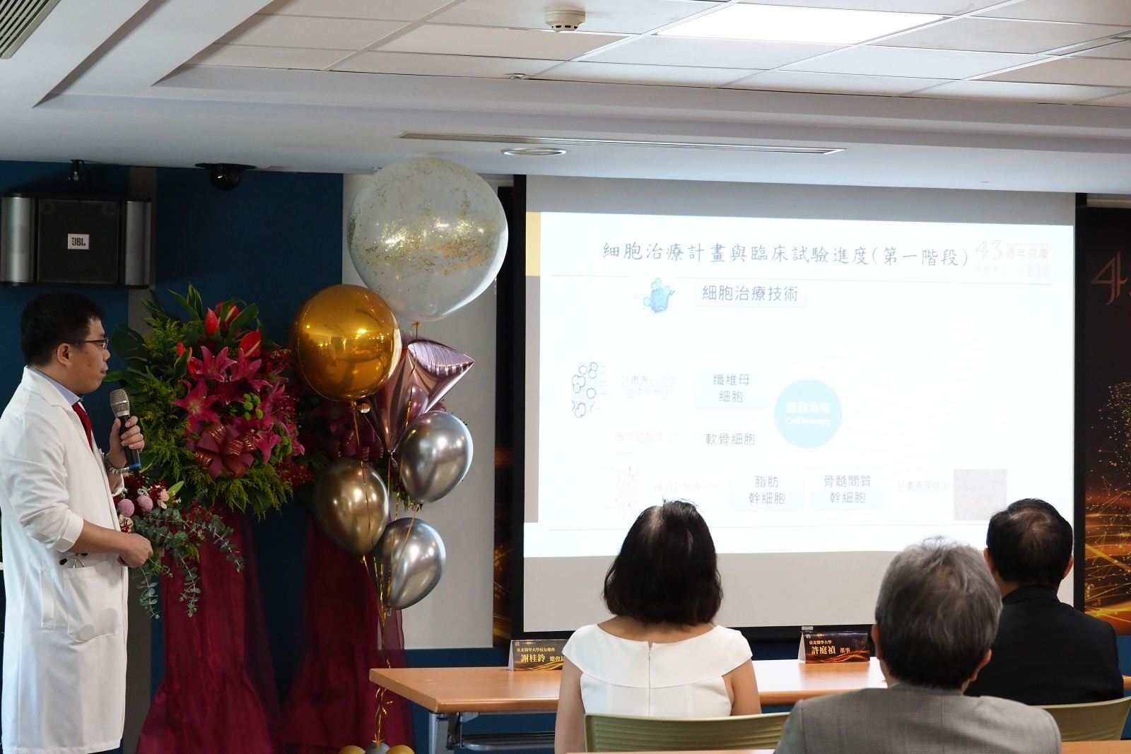 迎向精準醫療,附醫積極推動細胞治療中心設置,為病患開創新的治療契機,院慶典禮中由細胞治療中心執行長蕭世欣醫師說明細胞治療的特色,同時舉辦捐贈儀式,感謝光麗生醫捐贈血液成份分離機,為細胞治療再添利器。