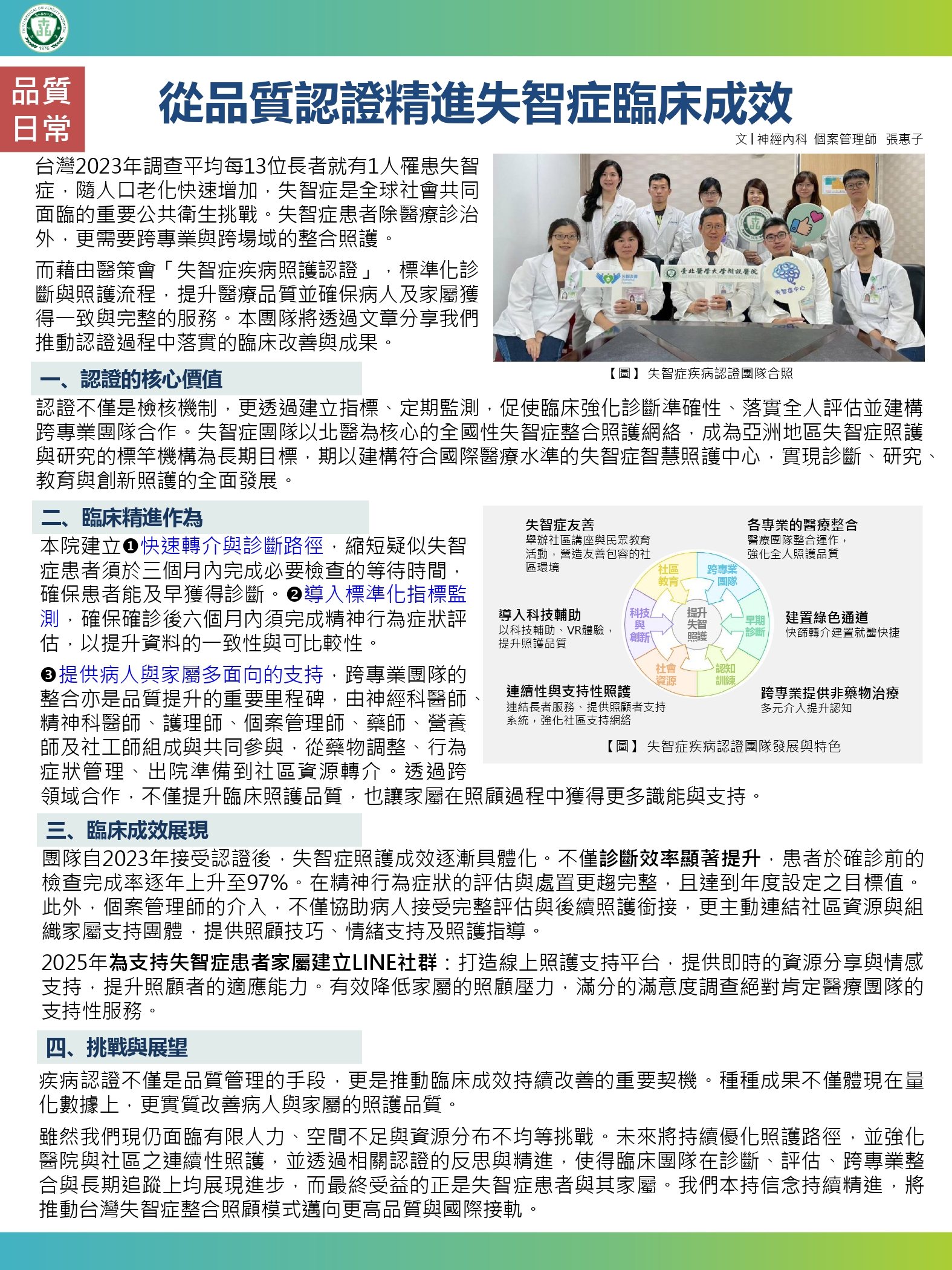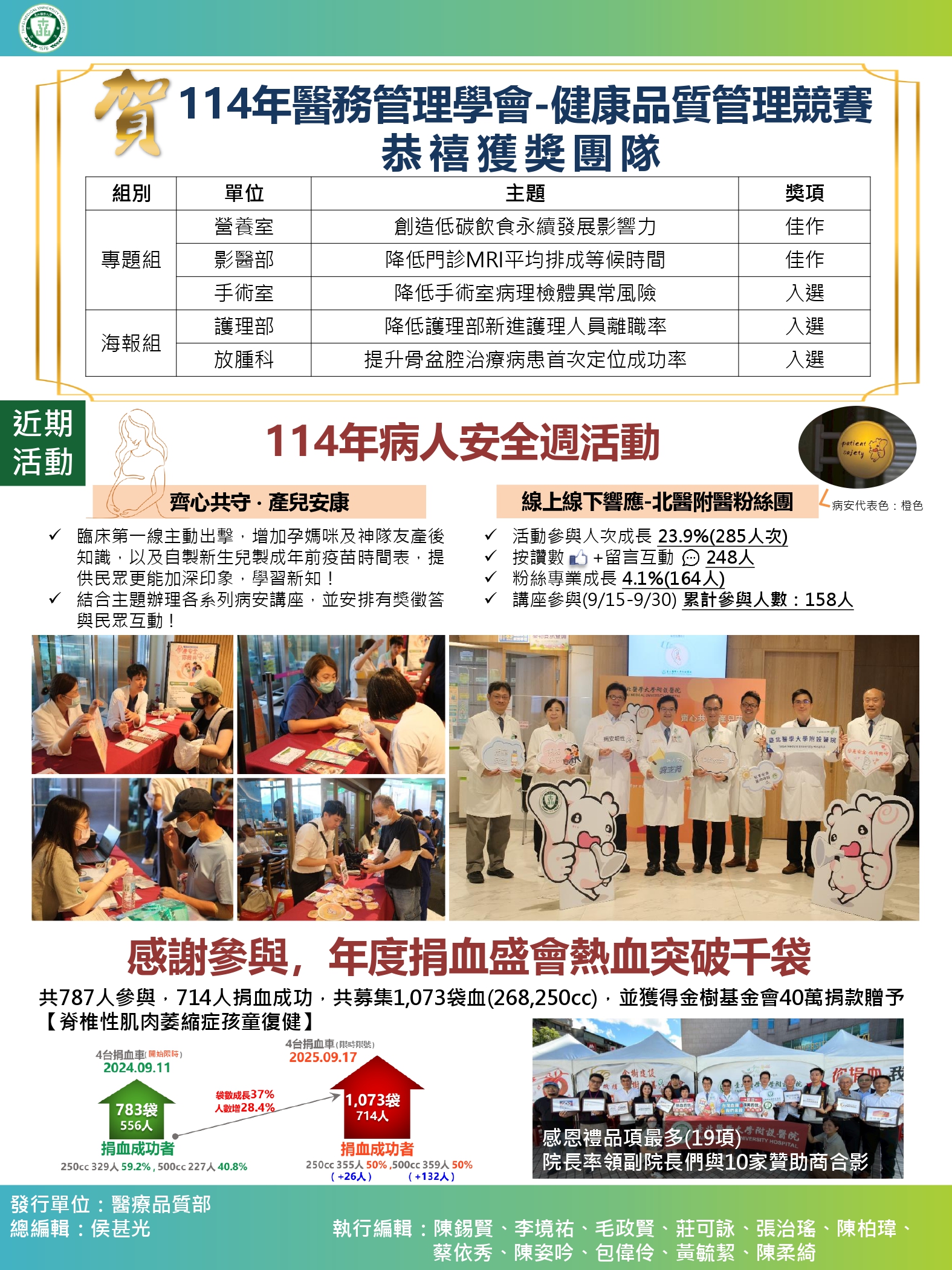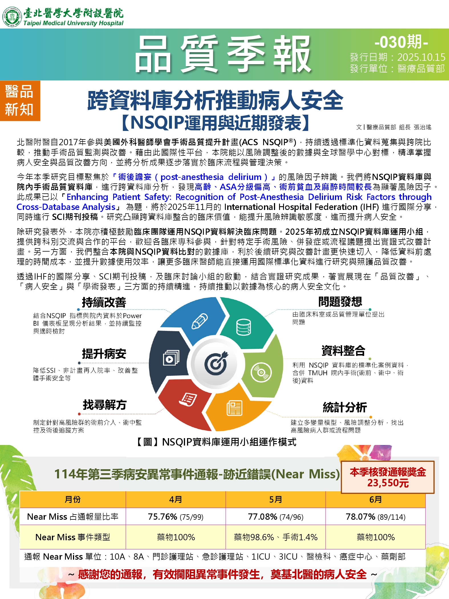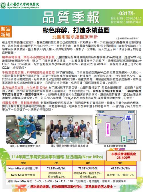為提升全院病人安全風氣,自2018年8月起,醫品部每季發行品質季報,提供近期醫療品質與病人安全新知、國際醫品病安趨勢、國內外發表及競賽等活動訊息,歡迎多加利用。